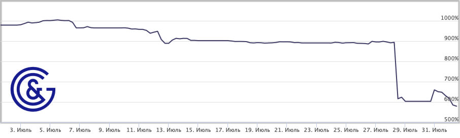The Derevo strategy came out on top in terms of yield based on July results. In the 1,138 days that the manager worked on the account, the strategy’s profitability hit 680.41%. The maximum drawdown within this time frame was 59.57 percent.