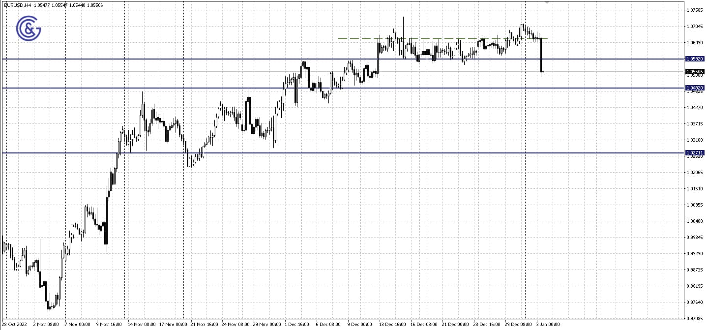 На четырехчасовом графике EUR/USD видим, что у пары еще есть запас хода к поддержке коридора 1,0492 - 1,0592. При ее достижении есть вероятность как разворота вверх, так и дальнейшего падения.
