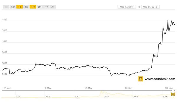 Уже 6 числа цена выходит на рубеж 1500$ на новостях об ожидании ФРС США. На 11 мая курс остановился на отметке 1892 доллара, что стало новым рекордом ценового уровня криптовалюты.
