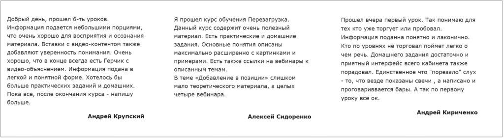 Участники «Перезагрузки» отмечают простоту материала и ясность подачи. Довольны и тем, что есть домашние задания и обратная связь, которая помогает увидеть свои ошибки в процессе обучения и не допускать их при работе на рынке.