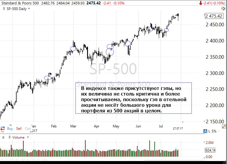 Рисунок 2. Индекс SP-500 и величина гэпов за 2017-ый год.