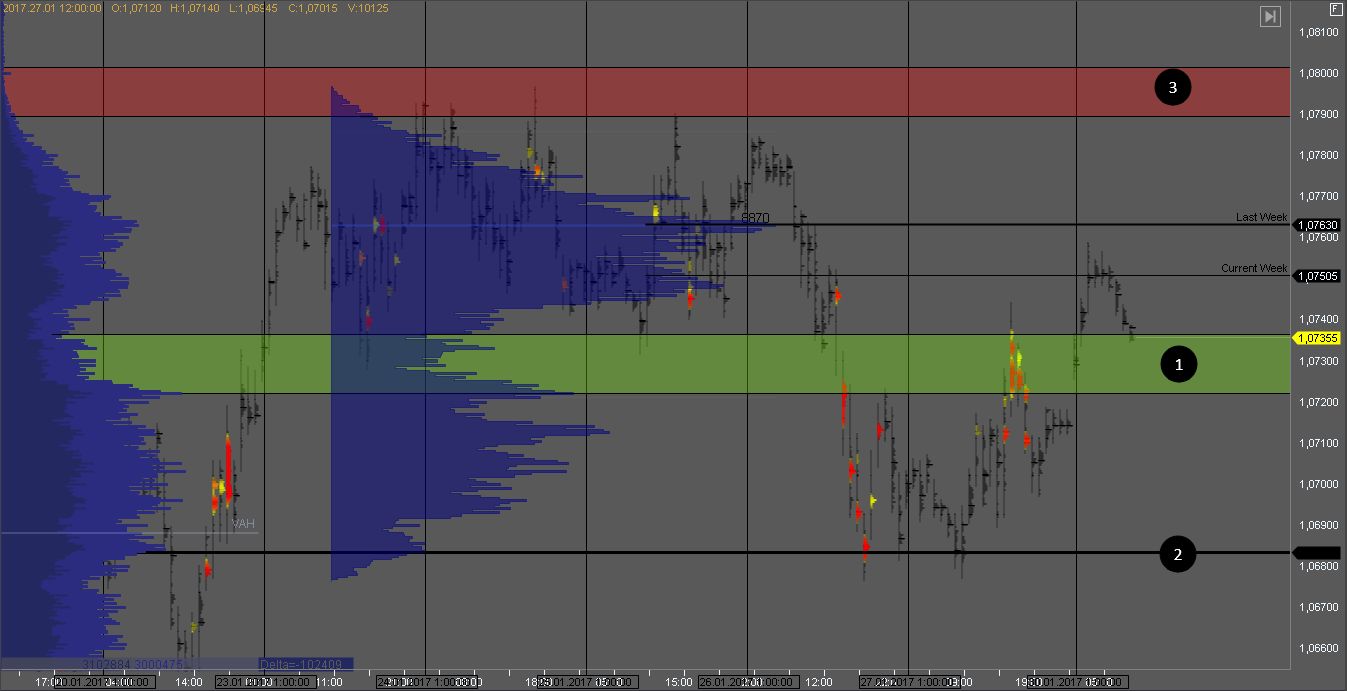 Канадец торгуется ниже объема продавца в зоне 1 и продажи на данный момент в приоритете. Но в случае пробоя зоны 1, мы получим признаки слабости продавца, и покупки могут продолжиться к цели в зоне 3. Если продавец удержит котировку в зоне 1, цель для продавцов в зоне 2.