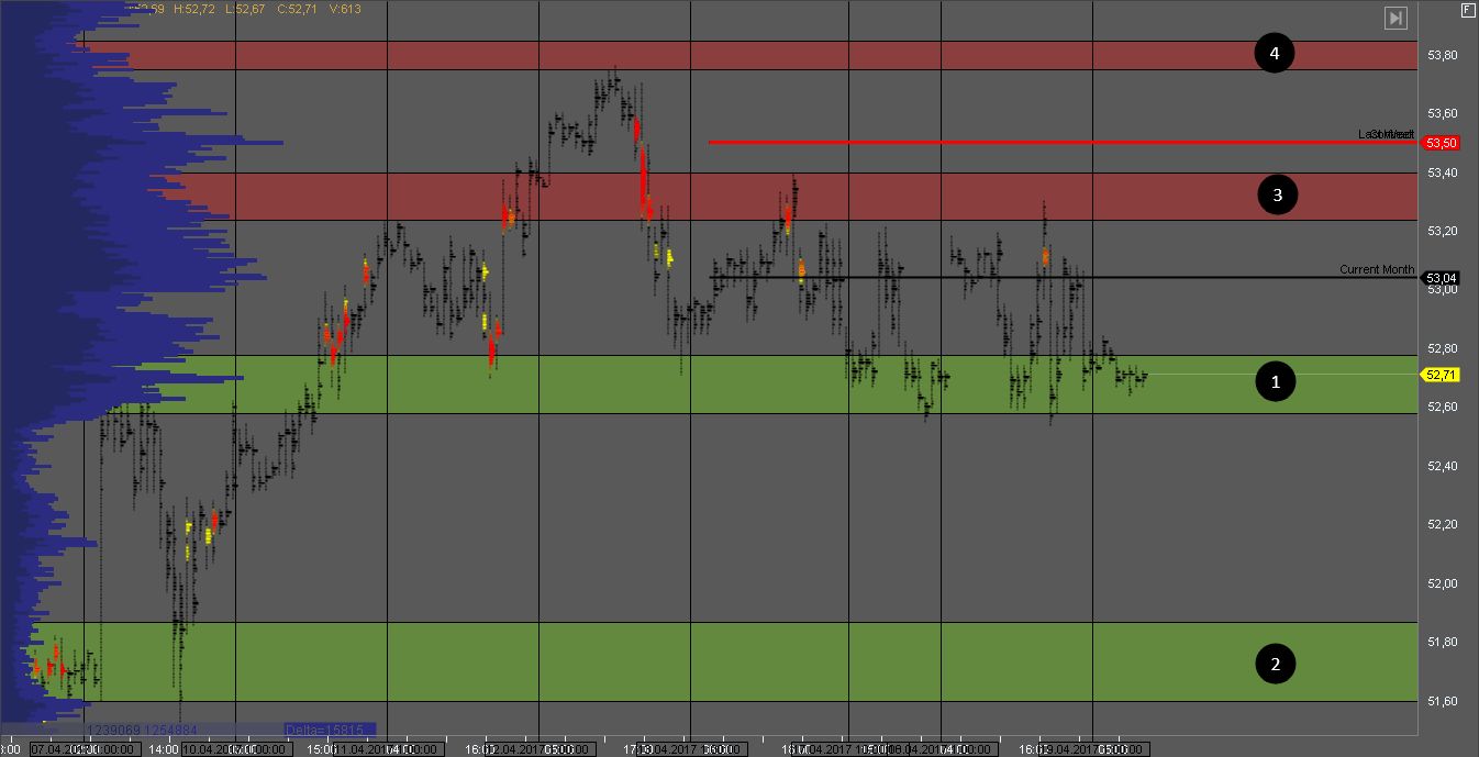 Нефть перешла на другой контракт и формирует новый объем в диапазоне с границами 1 и 4.