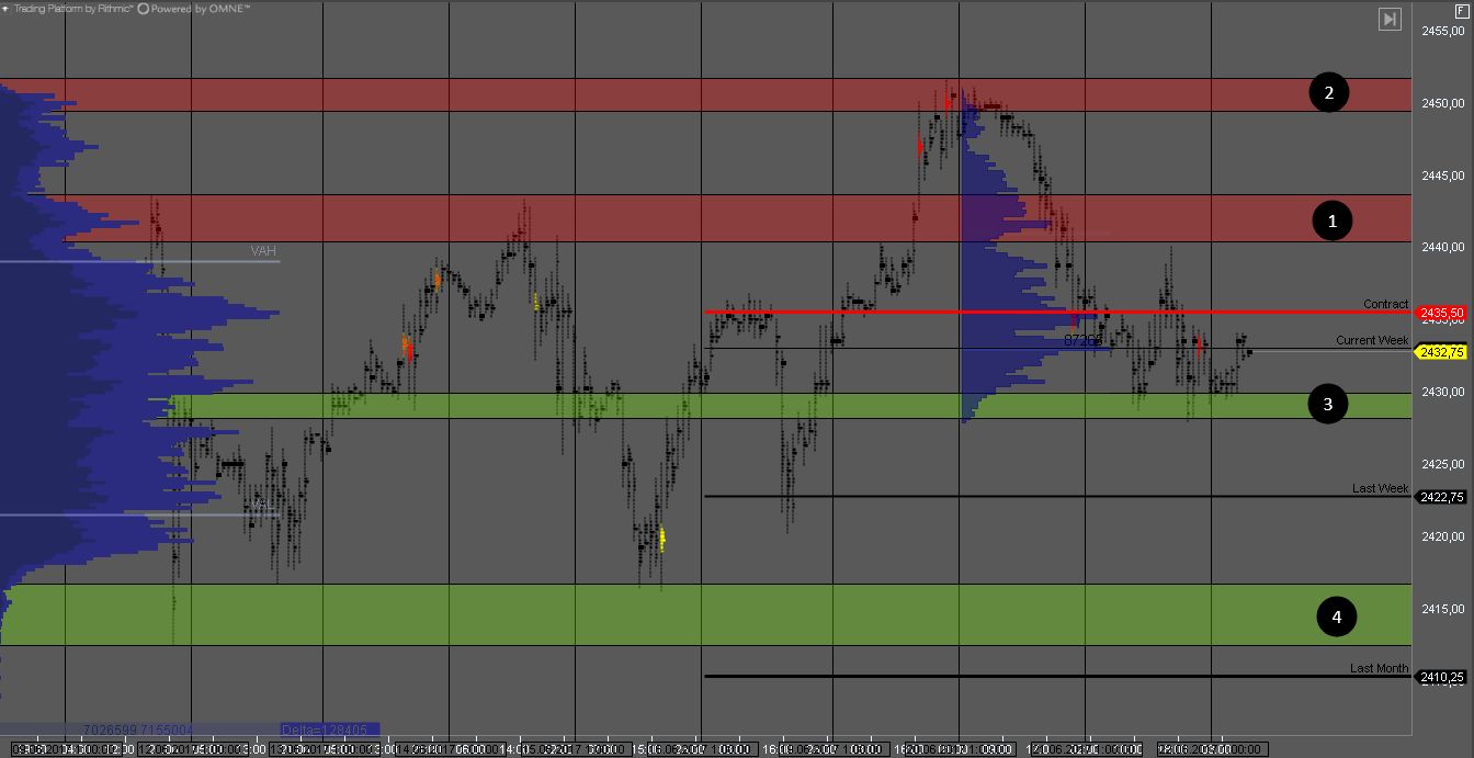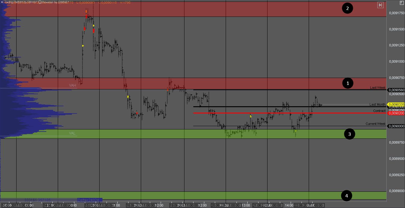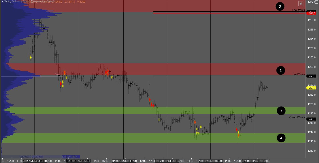 Если покупатель пробъет зону 1 с объемом продавца, рост может продолжиться к цели в зоне 2.