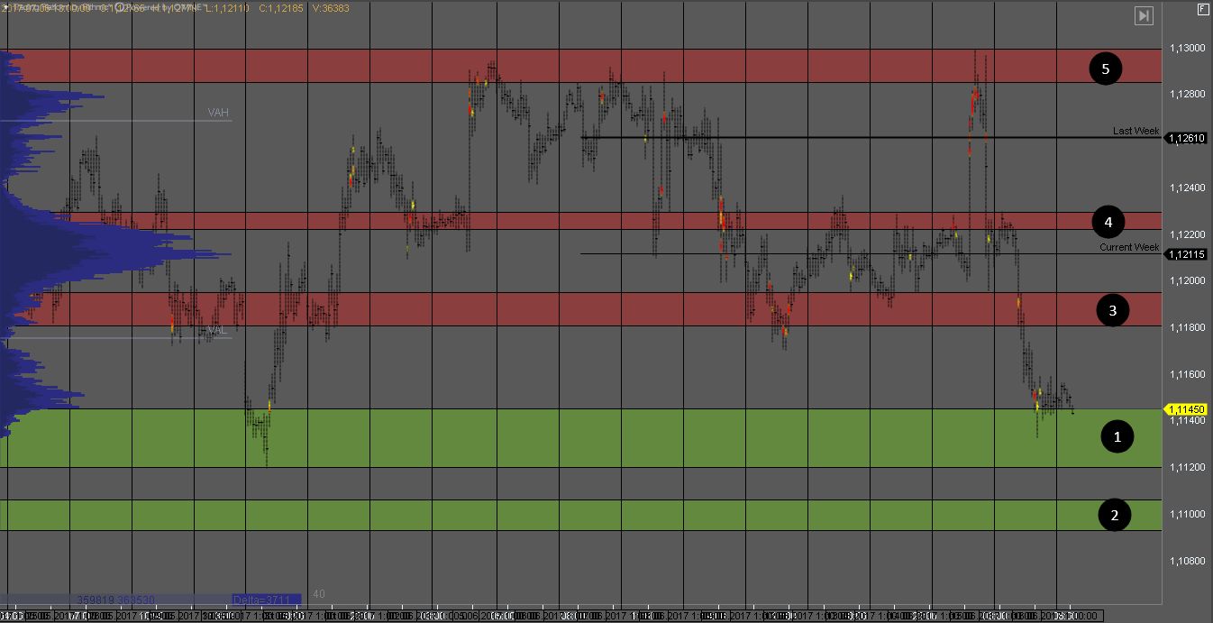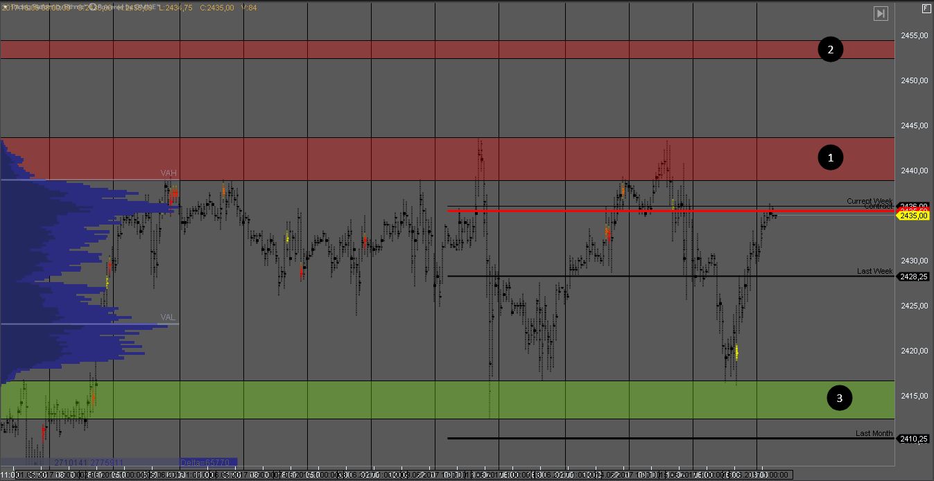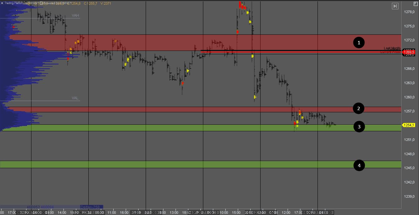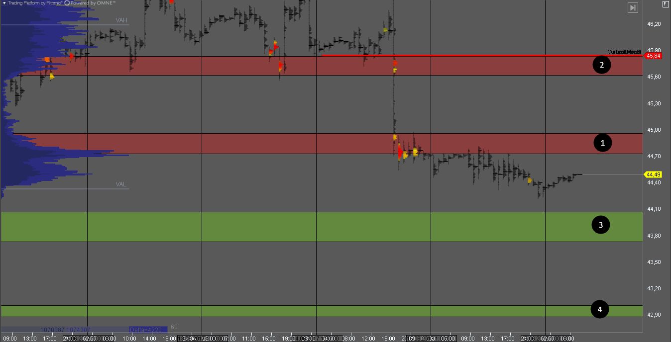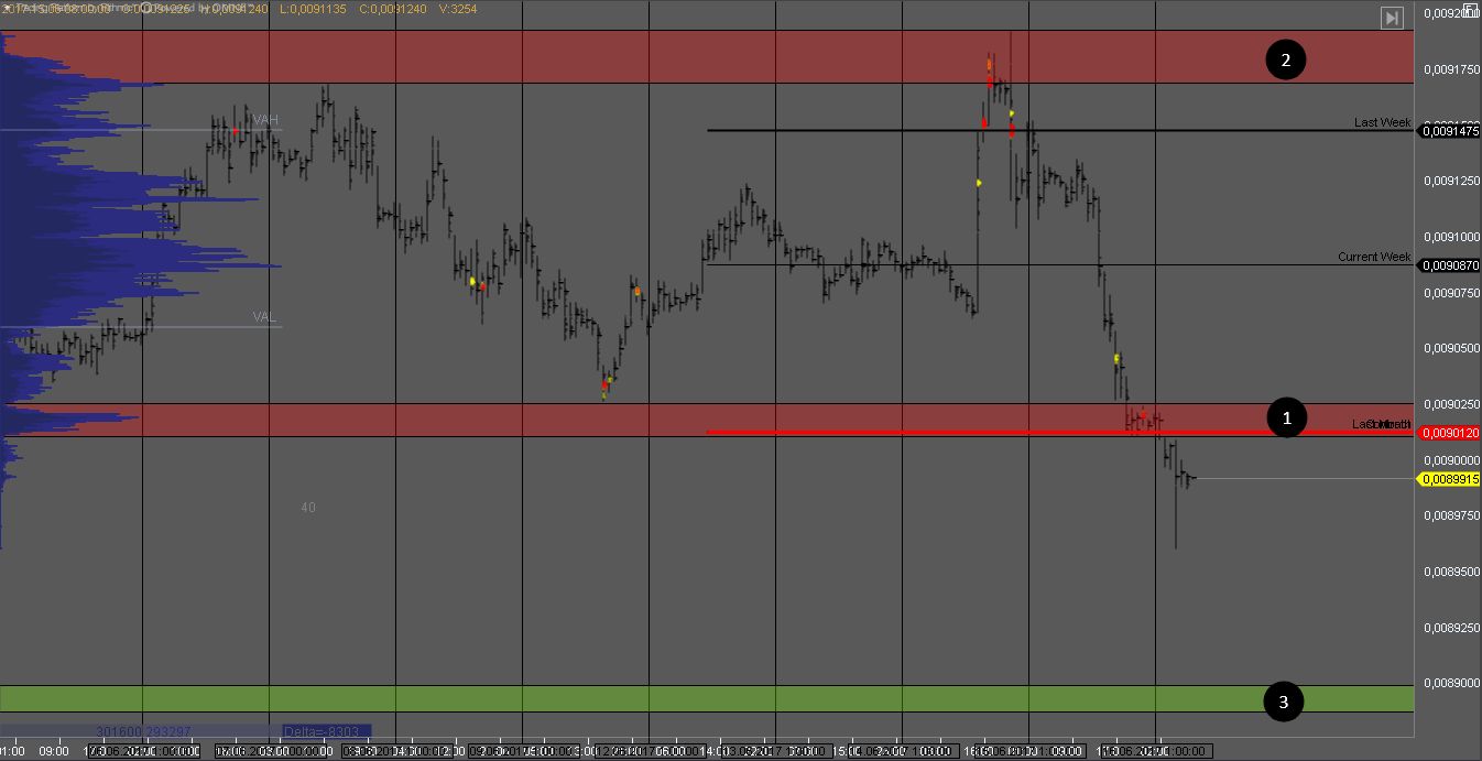 Продавец очень агрессивно вошел в рынок в четверг и достиг всех целей, а так же пробил зону 1. На тесте сопротивления 1 с объемом контракта, можно рассматривать возможности для продаж, но если зона будет пробита, продажи стоит отложить.