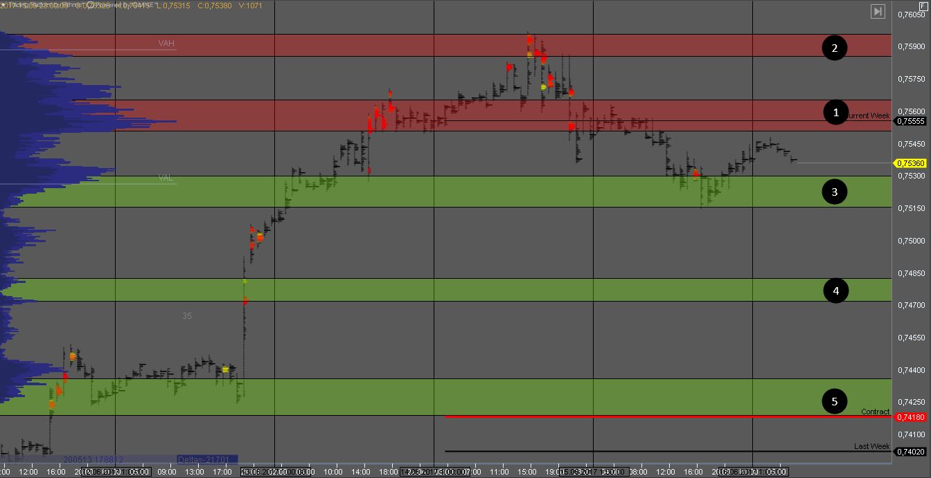 Канадец продолжил коррекцию и двигается вниз от серии крупных кластеров в зонах 1 и 2. На тестах этих зон можно искать возможности для продажи.