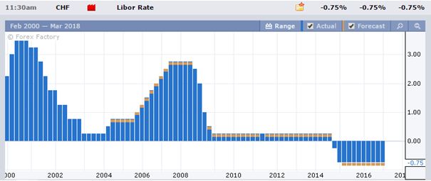 Страна с не менее интересной экономической ситуацией и действиями Центрального Банка, который опустил процентную ставку на минусовую территорию -0.75 %. Это Швейцария и швейцарский франк.