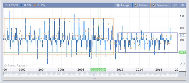 Из графика видно, что колебания по индексу были от -0.5 % до 1 %. Начиная с 2012 года колебания сузились от -0.5 % до +0.3 %.