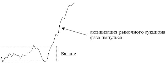 При выходе из баланса спроса и предложения по какой-либо причине (нехватка ликвидности, законченный набор позиции и ее реализация) начинается рыночный аукцион, сильное движение. Другое его название импульс или дисбаланс.