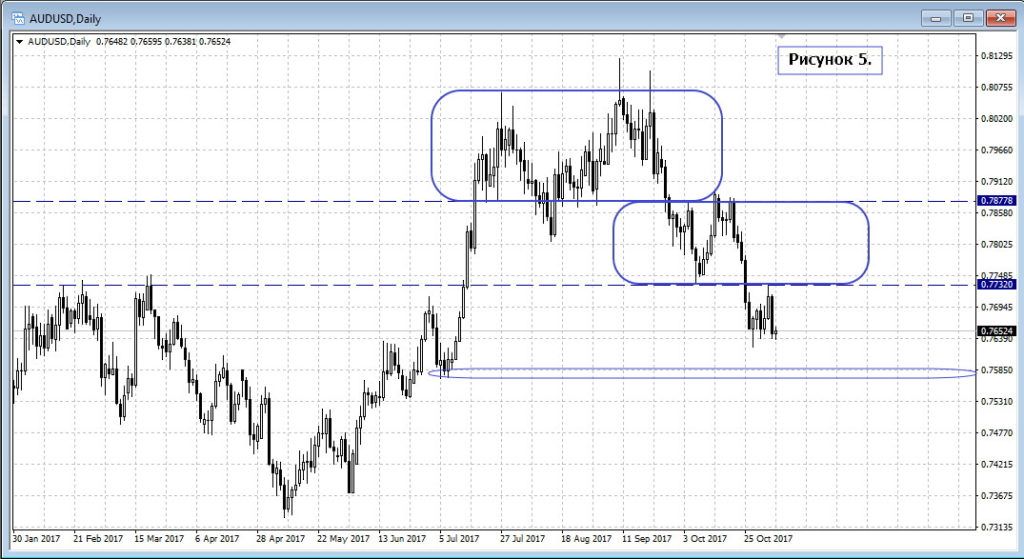 Корреляционно схоже последние недели ведёт себя американская валюта к австралийскому доллару, где ключевой уровень 0.77320 был пройден на волне распродаж, а затем подтверждён в ходе торговой сессии 02/11/2017. Цена так и не смогла закрепиться выше и высоки шансы повидать локальные минимумы в районе 0.76.