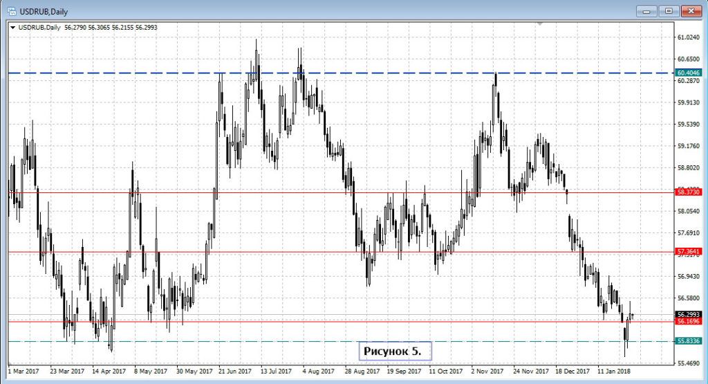 Вполне вероятно, что на в случае новой волны ослабления доллара США рубль ещё протестирует район 55.8, где и надо будет посмотреть на его относительную силу или слабость.