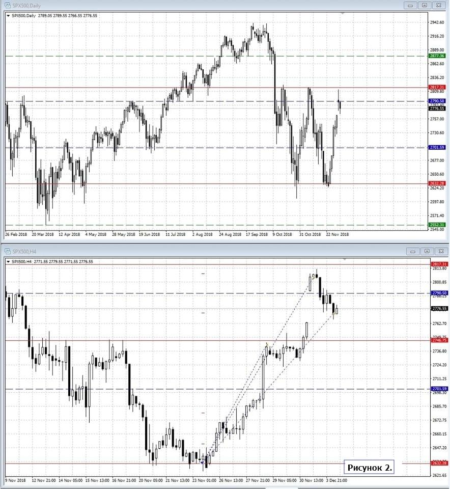 Ещё до солидной 20%-ой коррекции SPX500 уверенно удерживает 2632 и направляется до 2817. После этого и случился хороший обвал уже вернувшись и к 2632 и ниже.