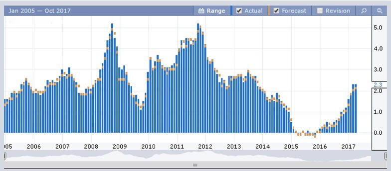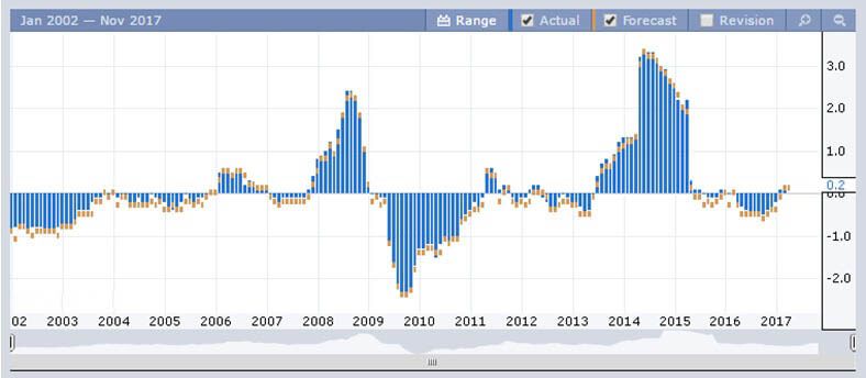 Из рисунка видно, что кризису 2008 года сопутствовала значительная дефляция. Сейчас данные ежемесячно показывают колебания индекса от -0,5 до +0,5. Даже при уверенном росте экономики ФРС будет придерживаться крайне осторожной политики в повышении процентных ставок, пока сохраняются риски дефляции.