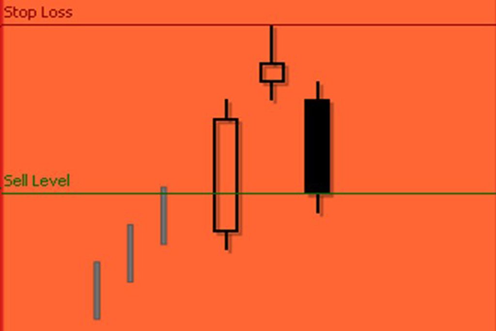 Формация включает в себя восходящую свечу, следом идет короткая свеча, похожая на «падающую звезду». Она образует гэп по отношению к уровню закрытия днем ранее. Крупная и нисходящая третья свеча означает серьезное давление со стороны трейдеров, желающих продавать.
