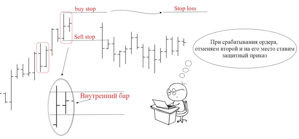 При внутреннем баре суть стратегии торговли заключается в следующем: когда он закроется и его максимумы и минимумы будут находиться в пределах определяющего бара, можно выставлять стоп-ордера на несколько пунктов выше и ниже определяющего бара для того, чтобы у нас открылась сделка, когда цена выйдет из этого диапазона.