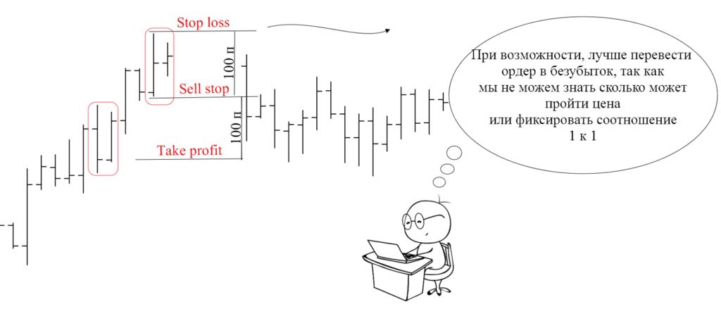 При торговле внутреннего бара Price Action мы не можем точно спрогнозировать, как долго продлится ценовое движение после пробития определяющего бара, поэтому после прохождения ценой некоторого расстояния нужно перенести стоп-лосс в безубыток.