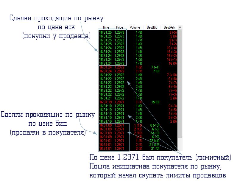 Лента принтов (Time&Sales) и ее вариации – инструмент для анализа, отображающий проходящие в текущий момент ордера, информацию об их величине и направлении сделки. Безусловно, хороший инструмент. Может использоваться вместе со стаканом или отдельно.