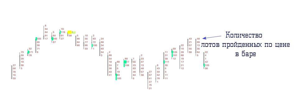 • футпринт и его вариации – отображает количество прошедших контрактов (лотность) по стоимости в баре: