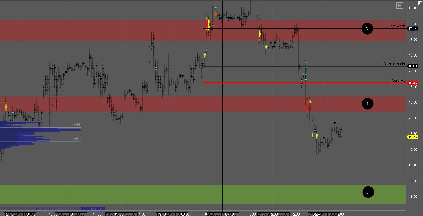 Продавец взял под контроль котировку в пятницу и пытается удержаться внизу. На тесте зоны 1 можно искать возможности для продажи с целью в зоне 3.