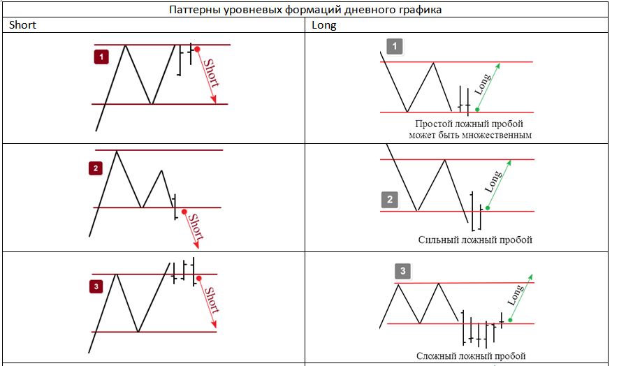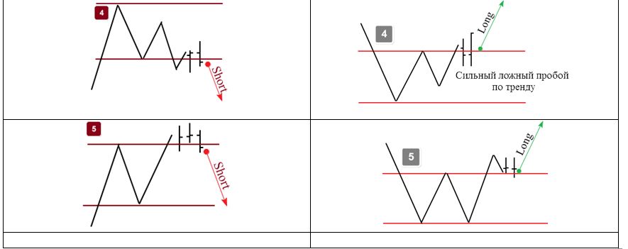 | Возможное обоснование входа | При пробое уровня и локальном удержании (в идеале закрепление 1 баром) торгую в расчете на выход по стопам покупателей в балансе | Возможное обоснование входа | При ложном пробое после подтверждения актуальности уровня торгую в продолжение локального тренда | ||