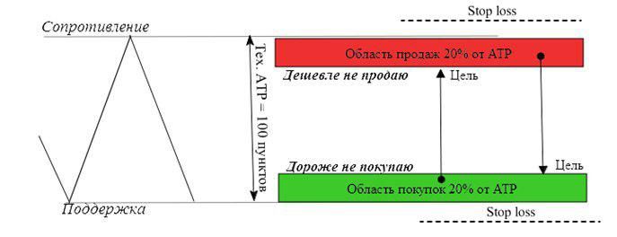 Поиск точек входа осуществляется не далее, чем 20 % технического АТР от цены уровня для удачной постановки стоп приказа за цену уровня.