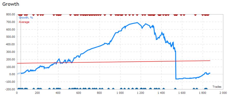Опять-таки, чем хороша временная проверка: на коротком временном отрезке даже системы усреднения (Мартингейл) могут показывать очень высокие цифры доходности. Но как только сделка приходится на однонаправленное трендовое движение инвестиция рискует быстро обнулиться.