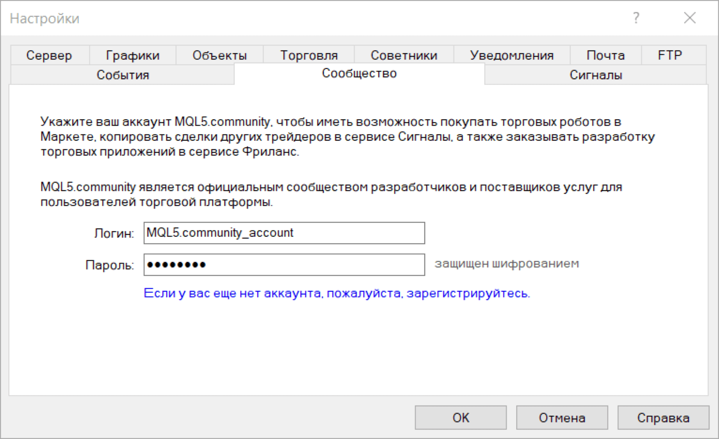 Для этого необходимо иметь торговый счет, открытый на платформе MT4 или MT5 и пройти регистрацию на сайте mql5.com. Зайти в меню «Настройки» и перейти во вкладку «Сообщество». Номер аккаунта в MQL5.community необходимо будет указать в окне настроек платформы.